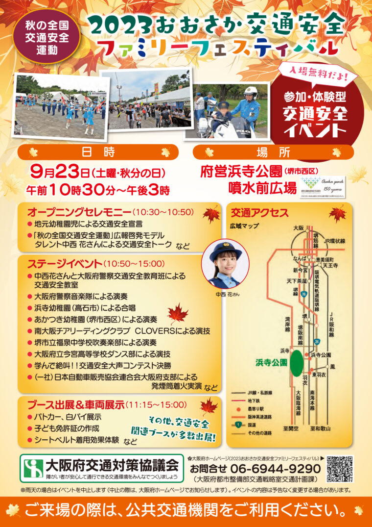 「2023おおさか交通安全ファミリーフェスティバル」に中西花がゲスト出演いたします。