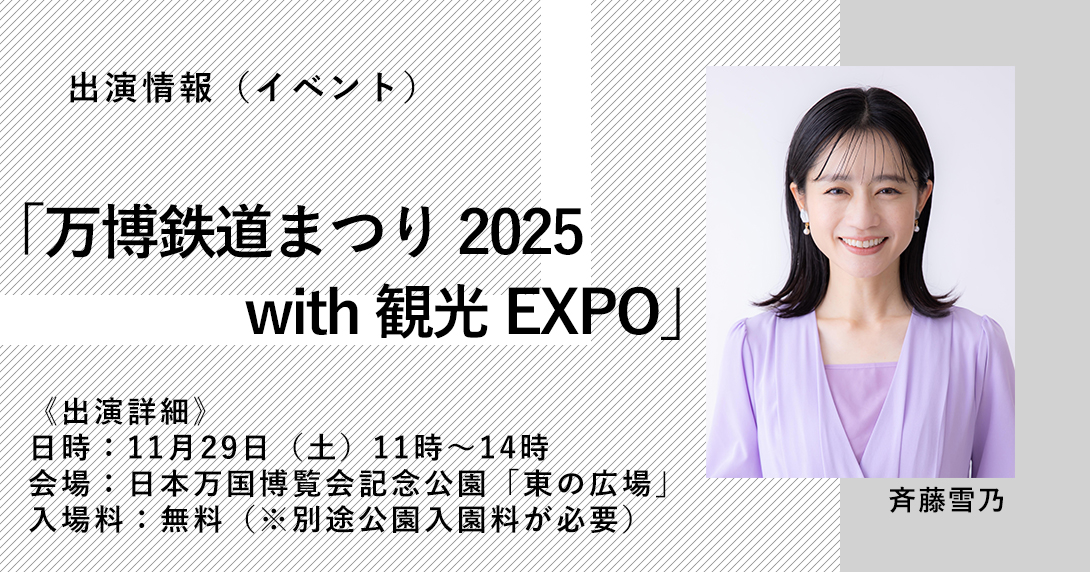 「万博鉄道まつり2025with観光EXPO」で斉藤雪乃がステージMCを務めます。