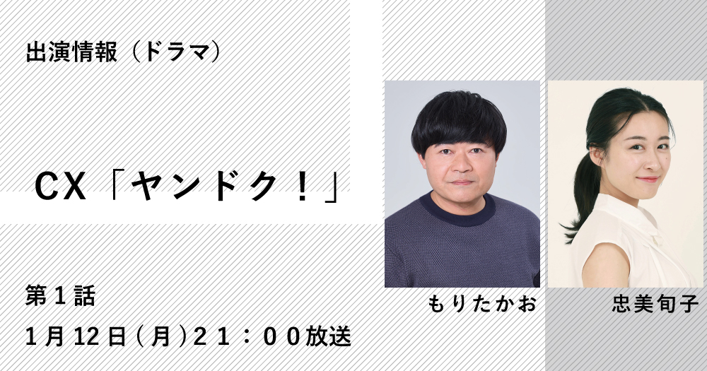 本日スタートのCX「ヤンドク!」にもりたかお(石塚哲也役)・忠美旬子(外来看護師役)が出演いたします!