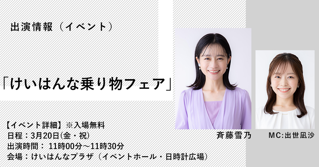 「けいはんな乗り物フェア」内トークショーに斉藤雪乃が、MCとして出世凪沙が出演いたします。